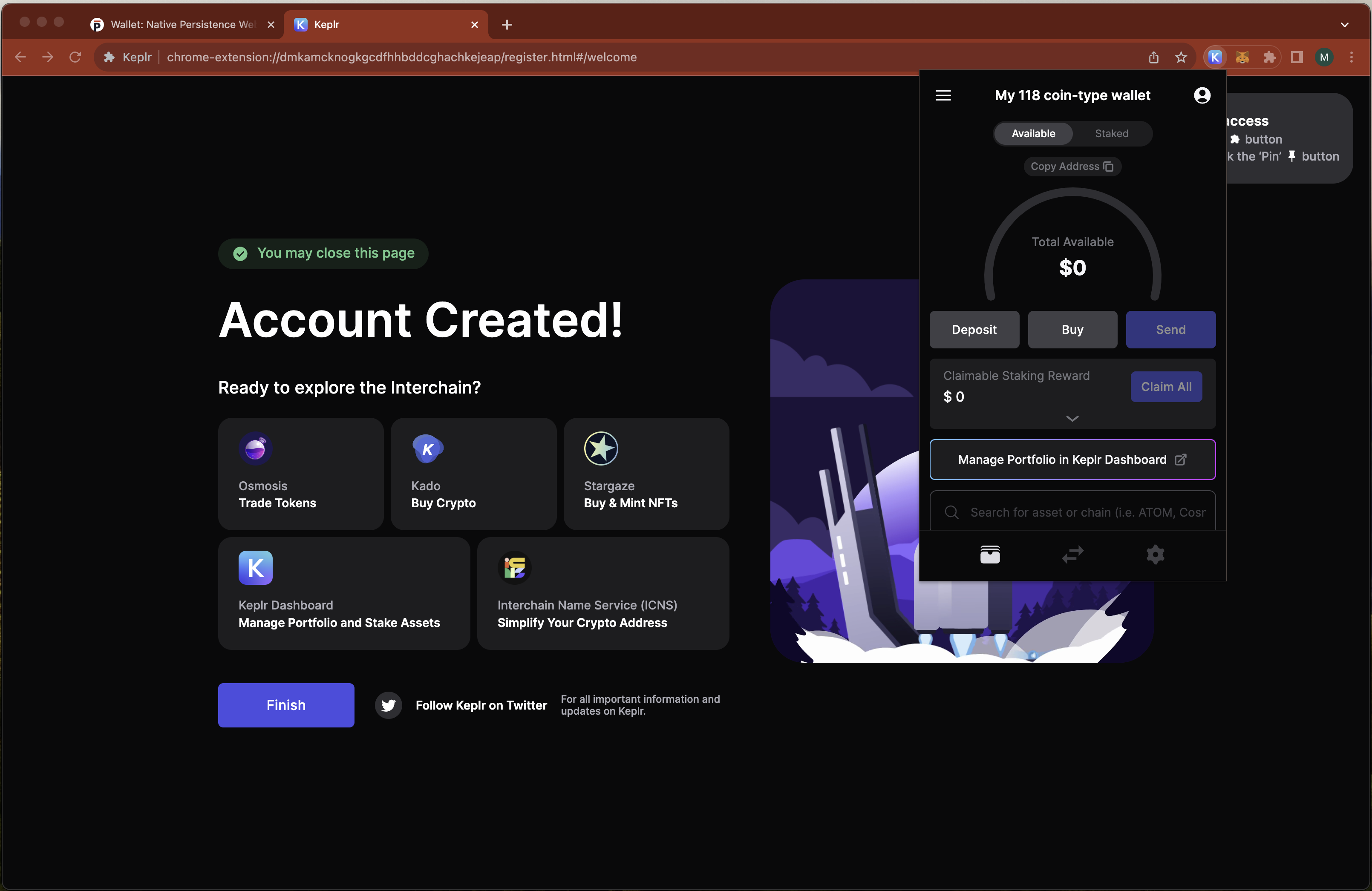 F. Voila! your 118 coin-type persistence wallet address is imported in keplr.